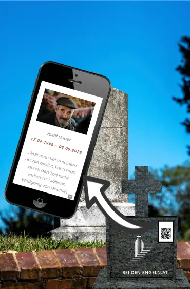 Eine QR-Tafel auf dem Grabstein ermöglicht Besucher:innen des Grabes auf die Geschichten, Erinnerungen und Fotos zuzugreifen. So entsteht eine Verbindung, die über unsere physische Welt hinausgeht und bis zu den Engeln reicht.
